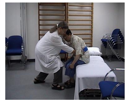 (1) Para a testagem do membro superior esquerdo, o terapeuta fica de frente para a paciente, posicionando-a com a cabeça em posição neutra e abdução de ombro. Com sua mão esquerda, deve aplicar uma força suave para deprimir ligeiramente e estabilizar o ombro do paciente (esta estabilização é importante pois durante o teste, o paciente pode elevar o ombro e aliviar a tensão aplicada ao sistema neural falsificando o resultado do teste), e com a mão direita, envolve a mão do paciente, garantindo o controle do polegar e dedos.