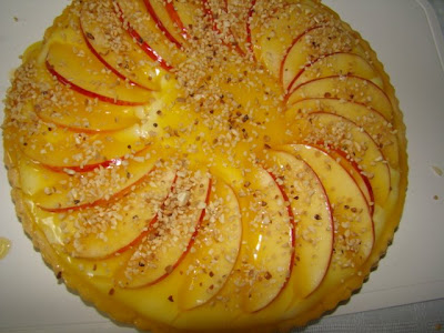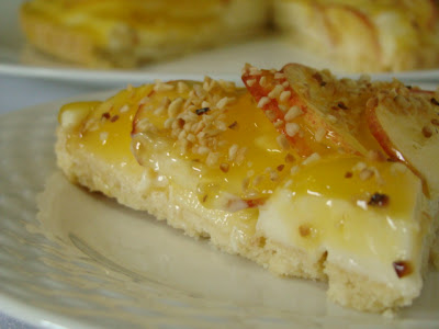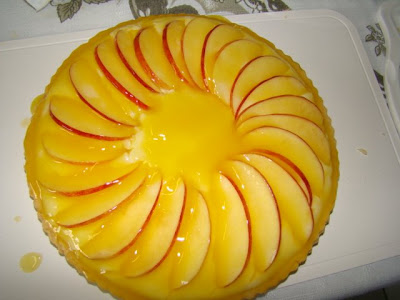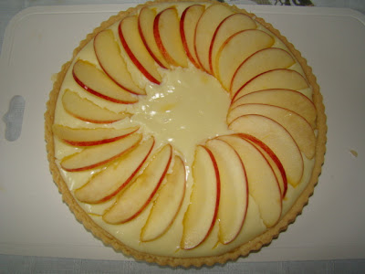 9. Creme:bata o leite condensado com as gemas, o suco e as raspas de limão, até obter uma consistência cremosa. 10. Recheie a torta coocando no fundo o creme de limão; por cima, decore as fatias de maçã e cubra tudo com a geléia das cascas. 11. Leve à geladeira por cerca de 1 hora antes de servir.