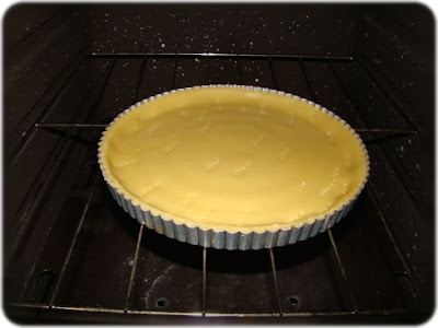 3. Abra a massa com o rolo e forre com ela o fundo e os lados de uma fôrma redonda com 21 cm de diâmetro.4. Fure o fundo da fôrma com um garfo e leve para assar em forno quente por 15 minutos.