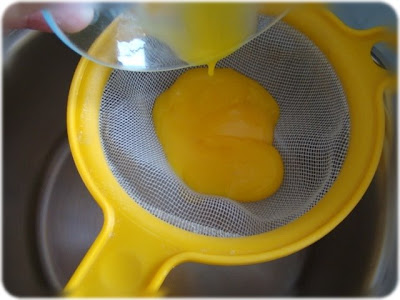 Passo 1: Peneire 3 gemas diretamente dentro de uma panela que irá ao fogo. Esse passo é importante para que o creme não fique com cheiro de ovos. Não apresse o processo com o fundo de uma colher. Se fizer isso as cutículas das gemas passarão pelos poros da peneira.